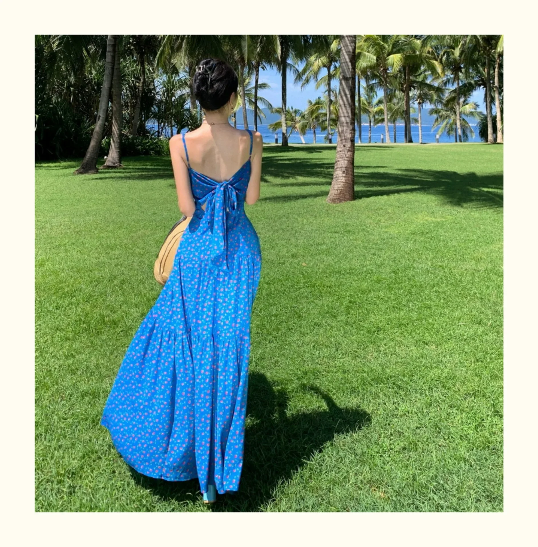 Blue Floral Halter Dress Women Summer Butterfly Knot Back High Waist Slim Long Skirt Beach Photo Clothes Sleeveless Empire Waist