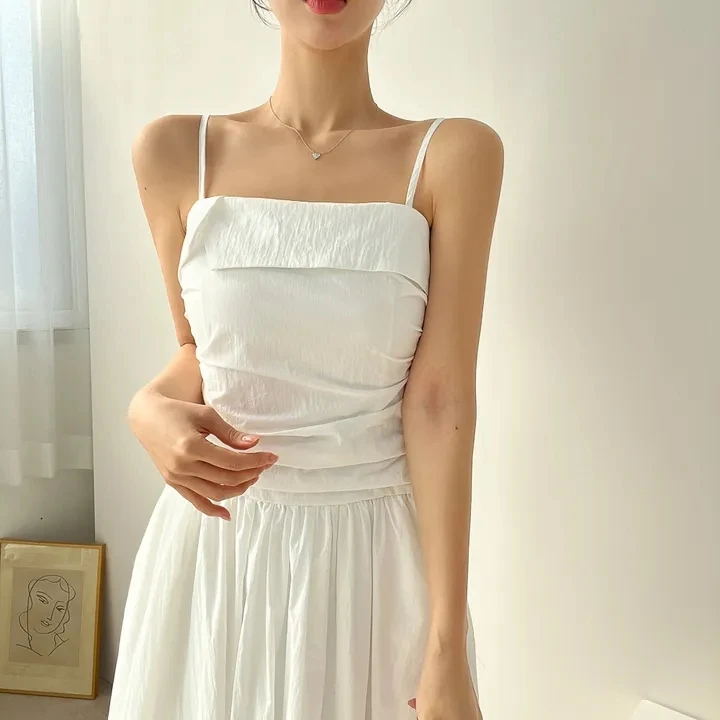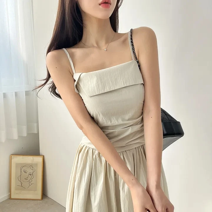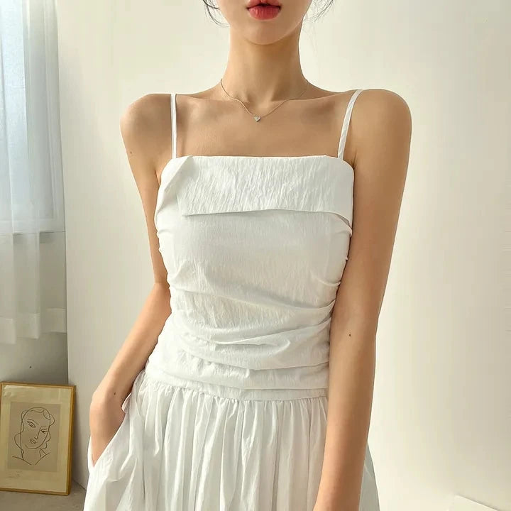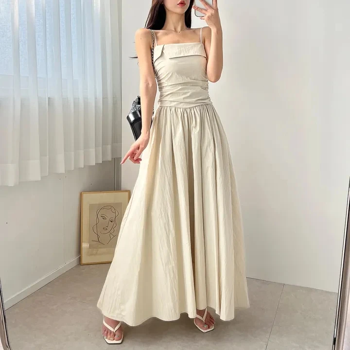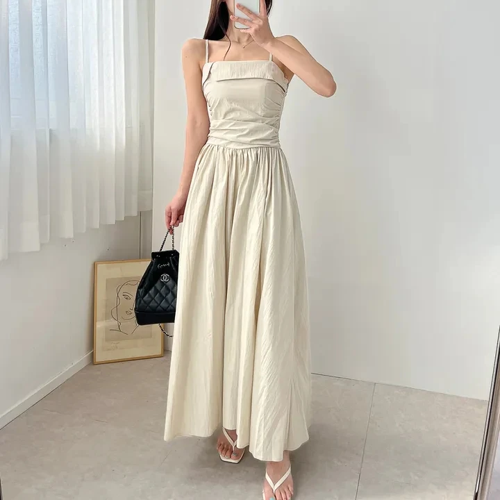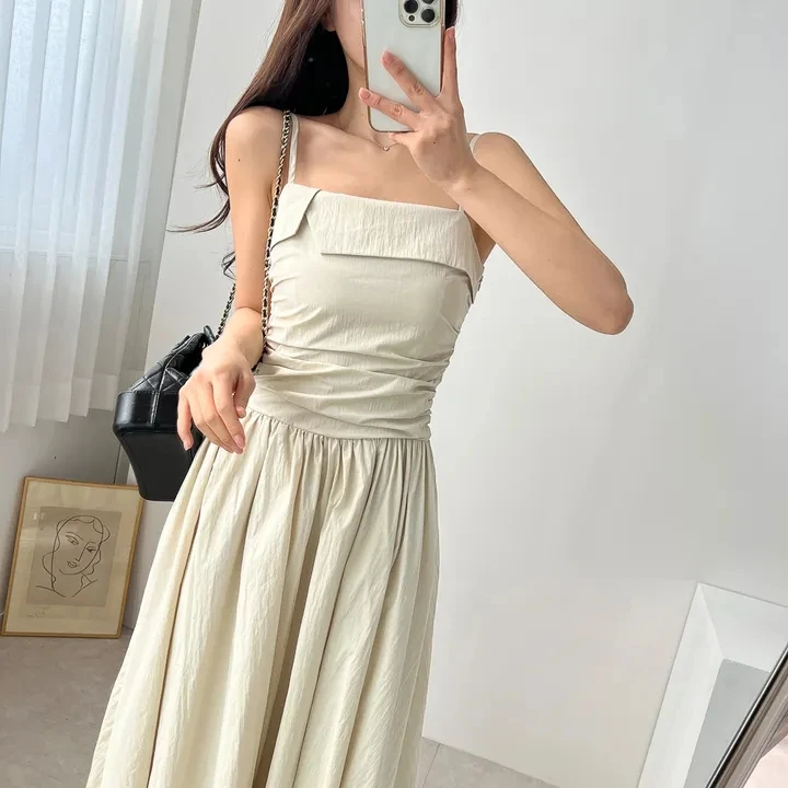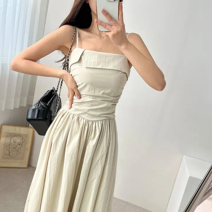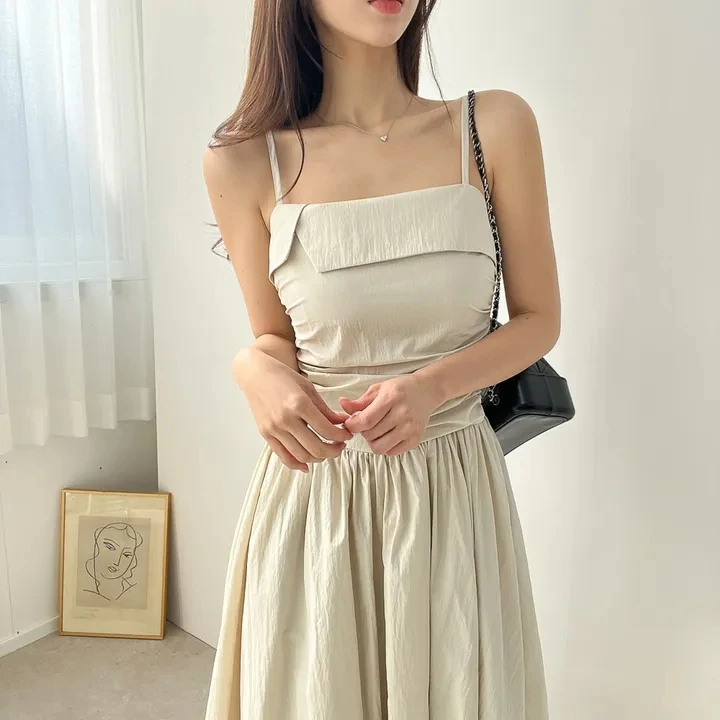 Chic Summer Gauzy Pleated Square Collar Split Vest Strap Dr A-Line Dr Commute High Waist Bell Bot Skirt Single Piece