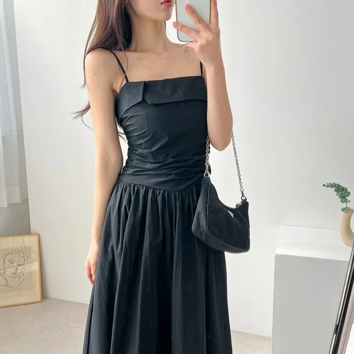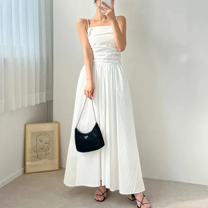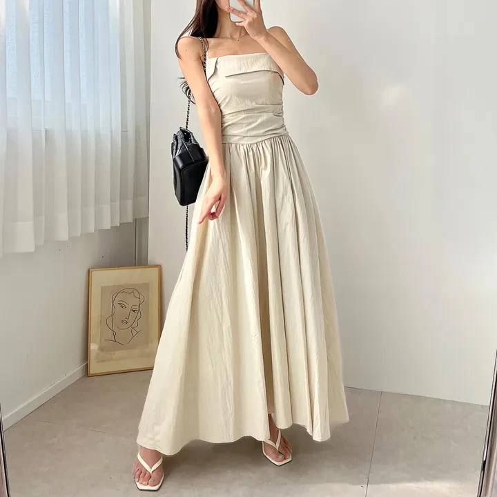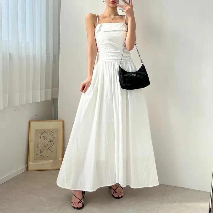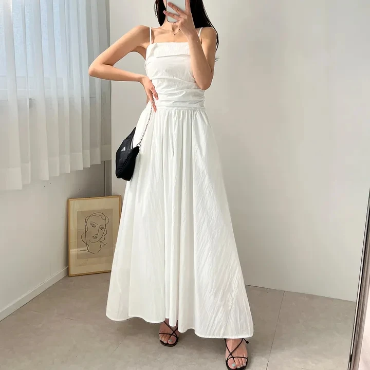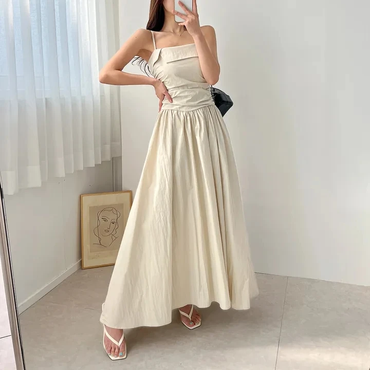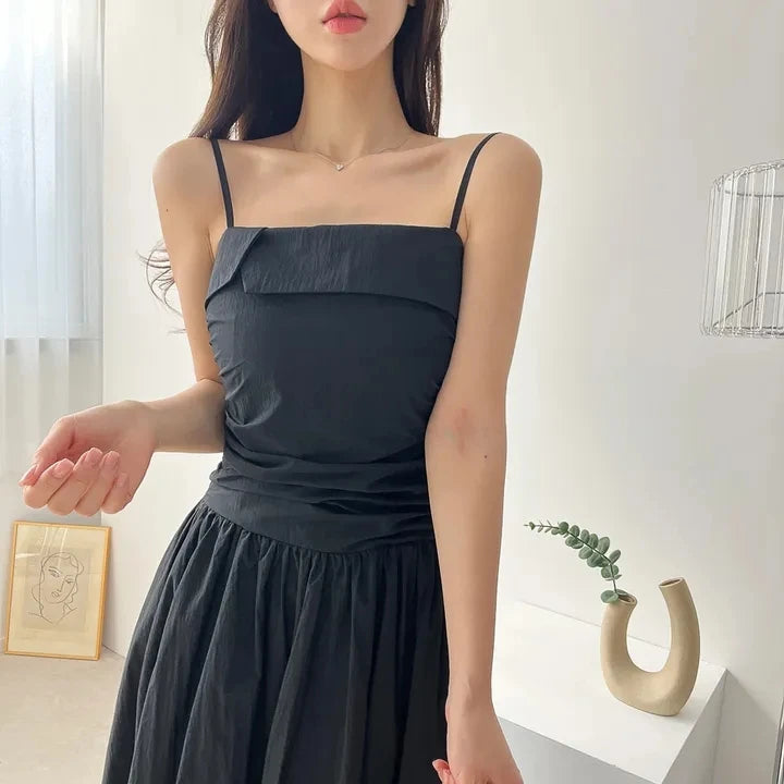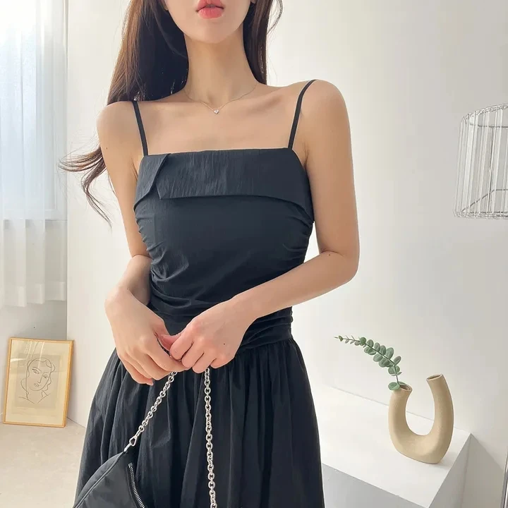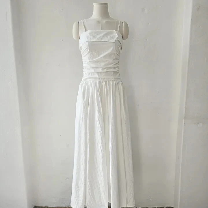 Chic Summer Gauzy Pleated Square Collar Split Vest Strap Dr A-Line Dr Commute High Waist Bell Bot Skirt Single Piece