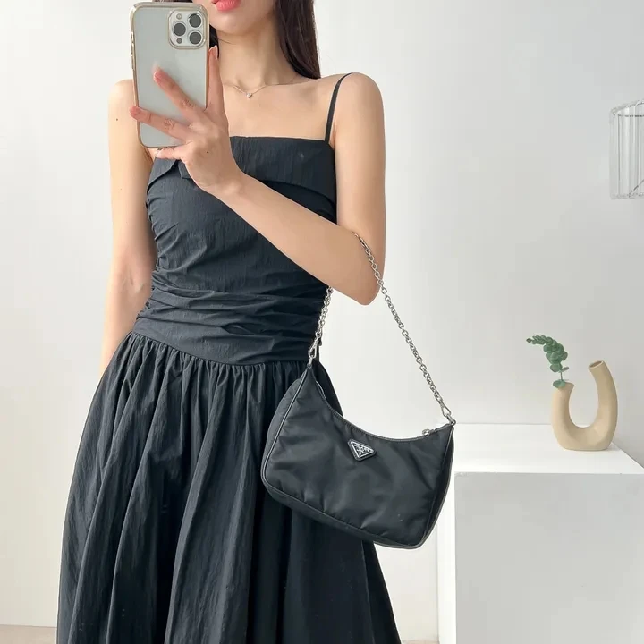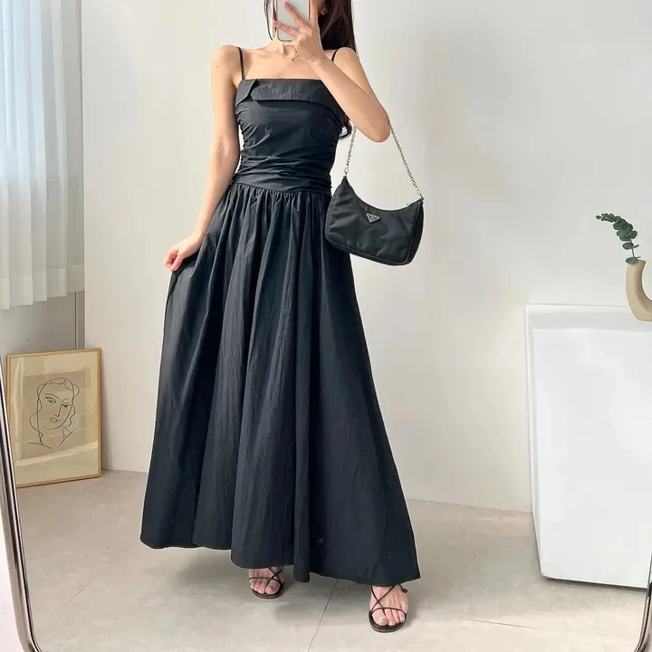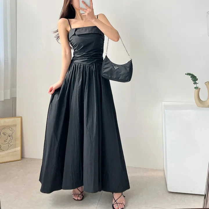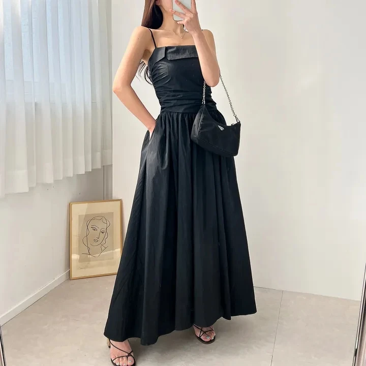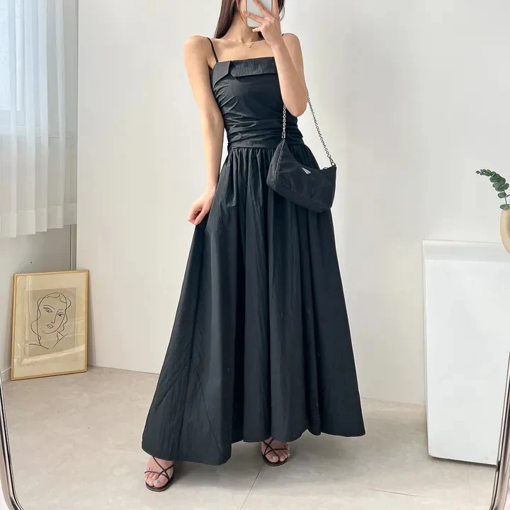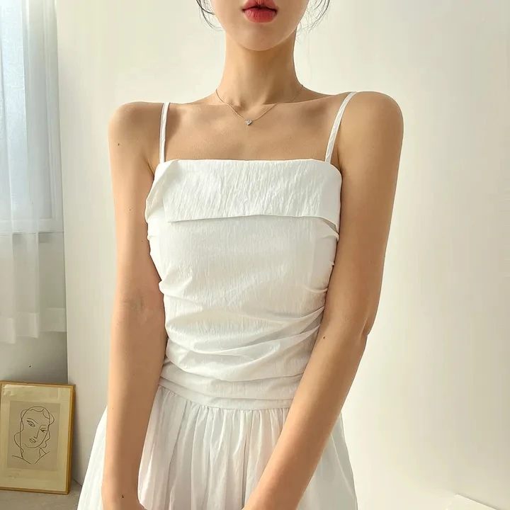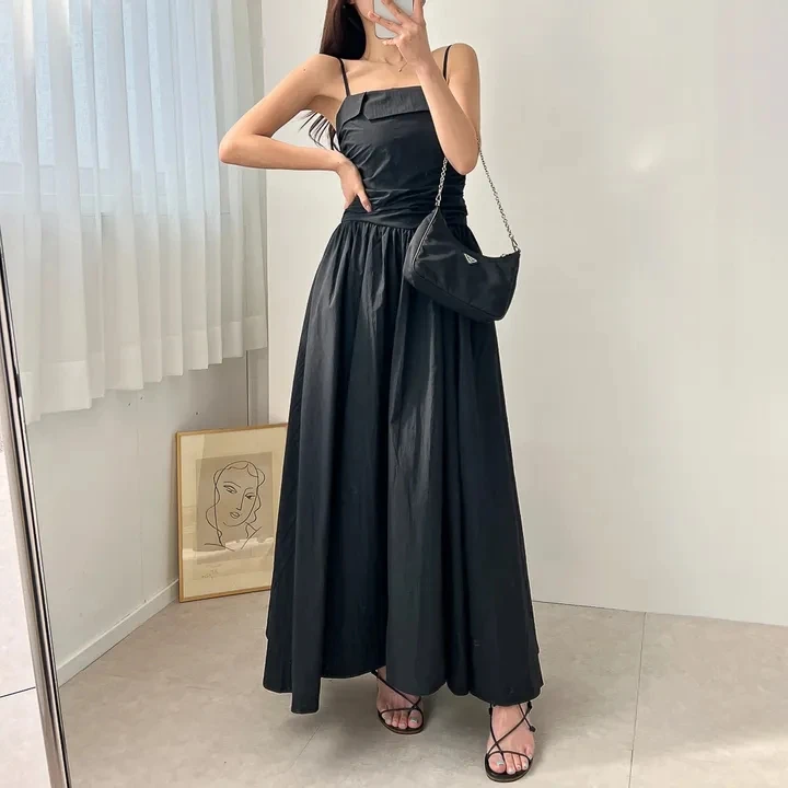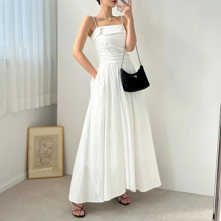 Chic Summer Gauzy Pleated Square Collar Split Vest Strap Dr A-Line Dr Commute High Waist Bell Bot Skirt Single Piece