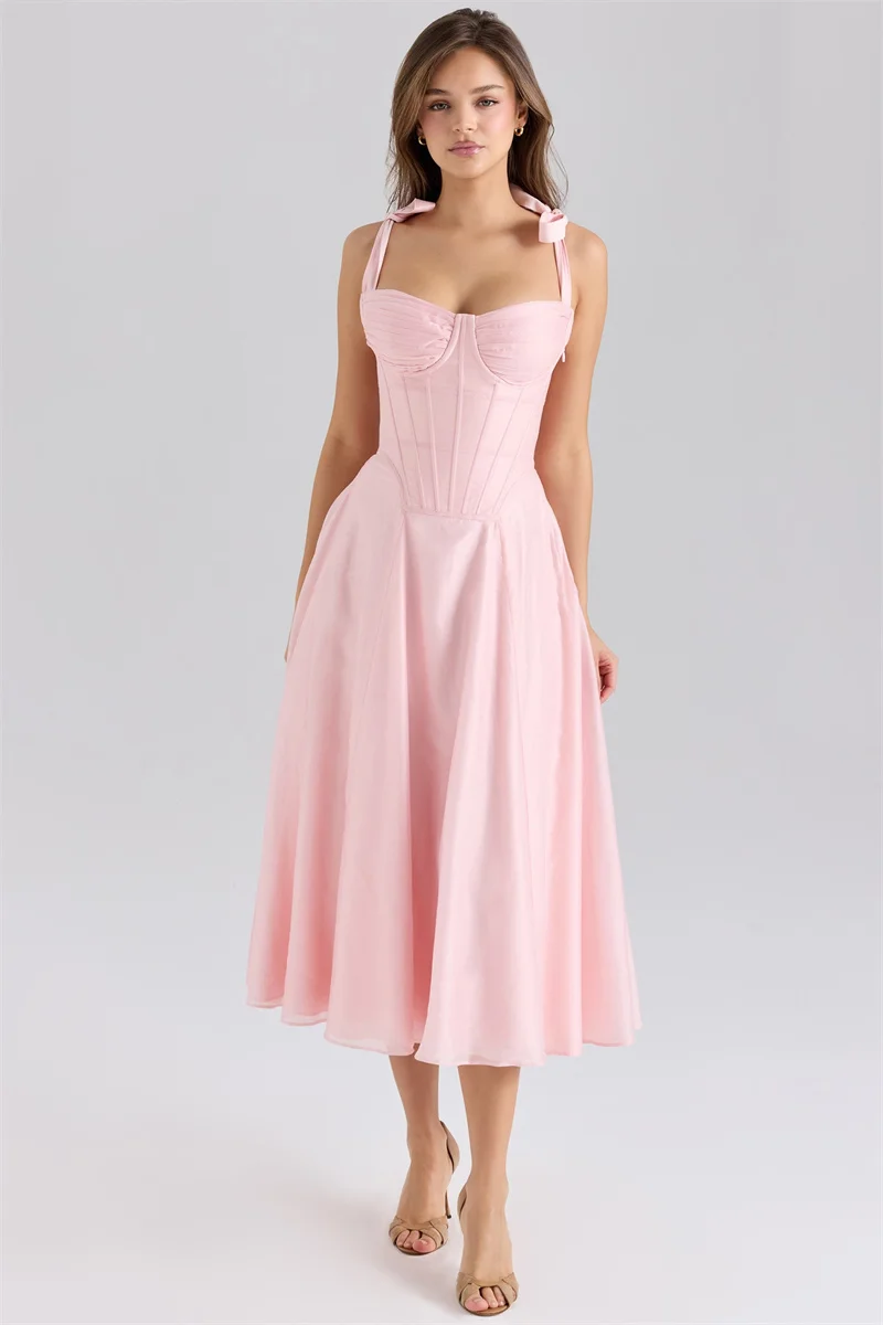 Corset Tie Strap Midi Dress Women Summer Fashion A-line Sleeveless Backless Sexy Robes Lady Elegant Club Party Long Dress 2025
