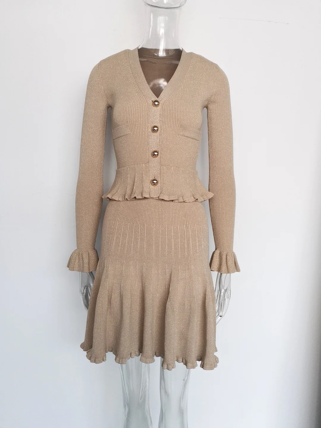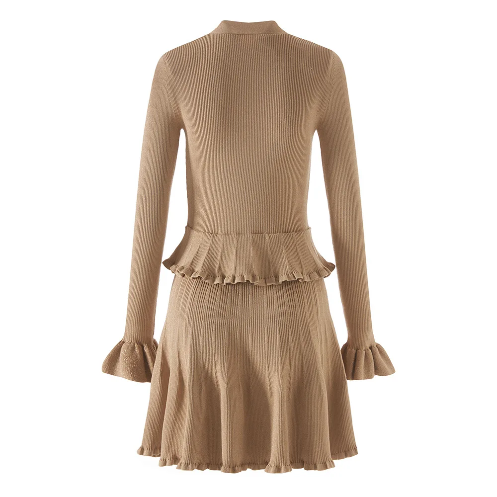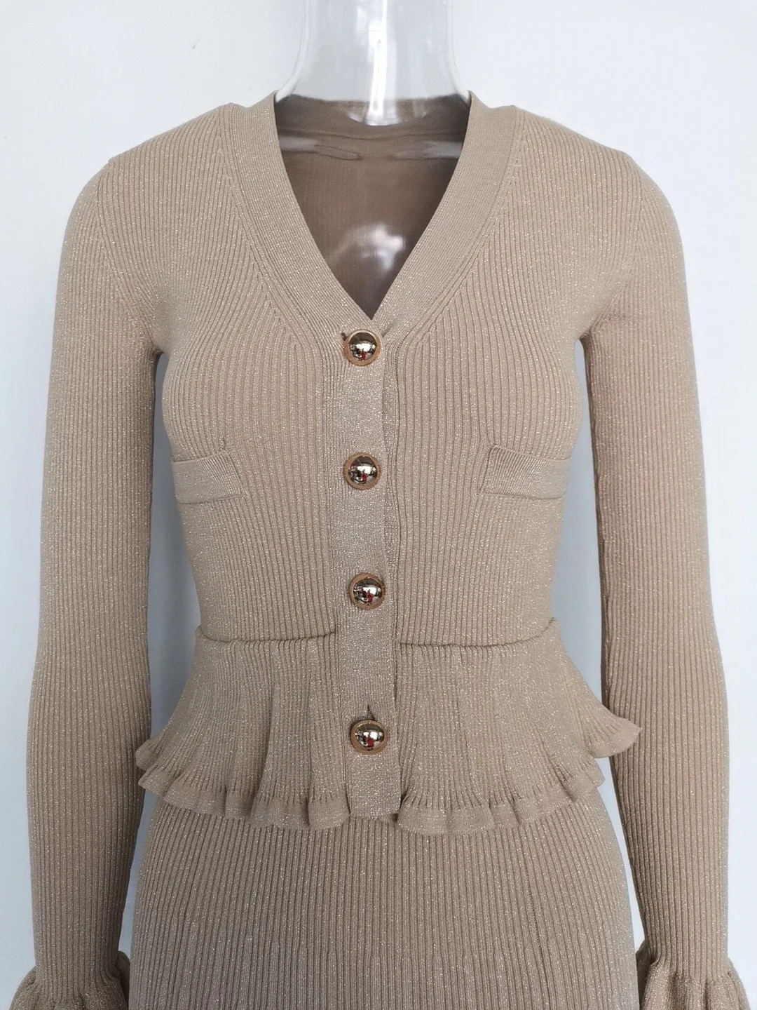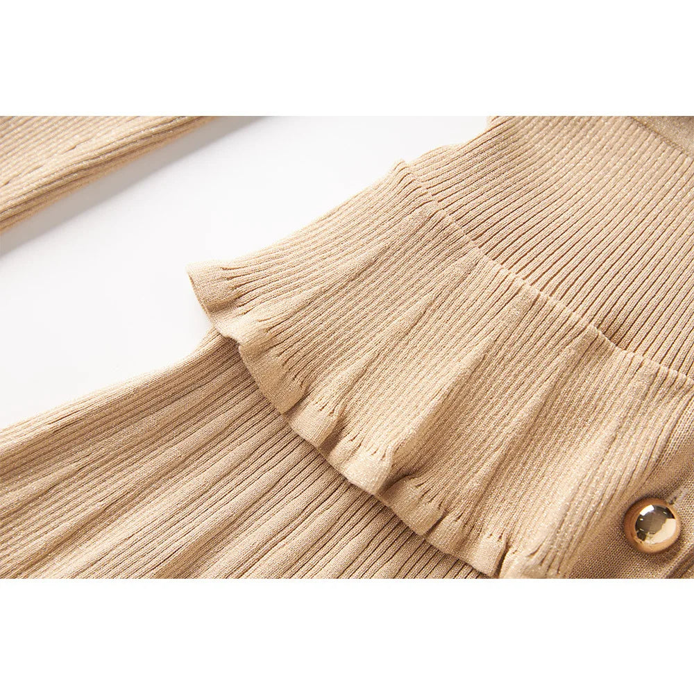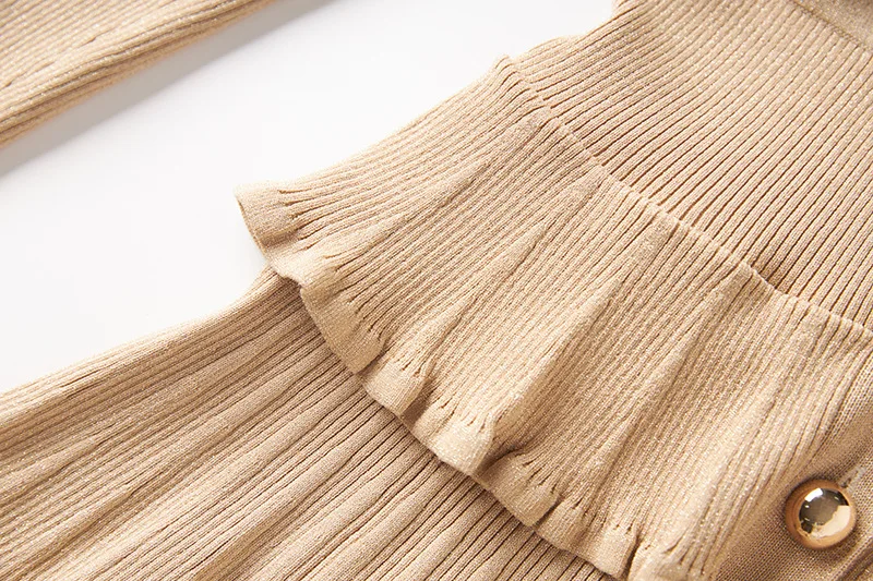 Elegant Knitted Dress Women Long Sleeve V-Neck Ruffles Single Breasted Dresses Party Fashion Office Lady Vestidos