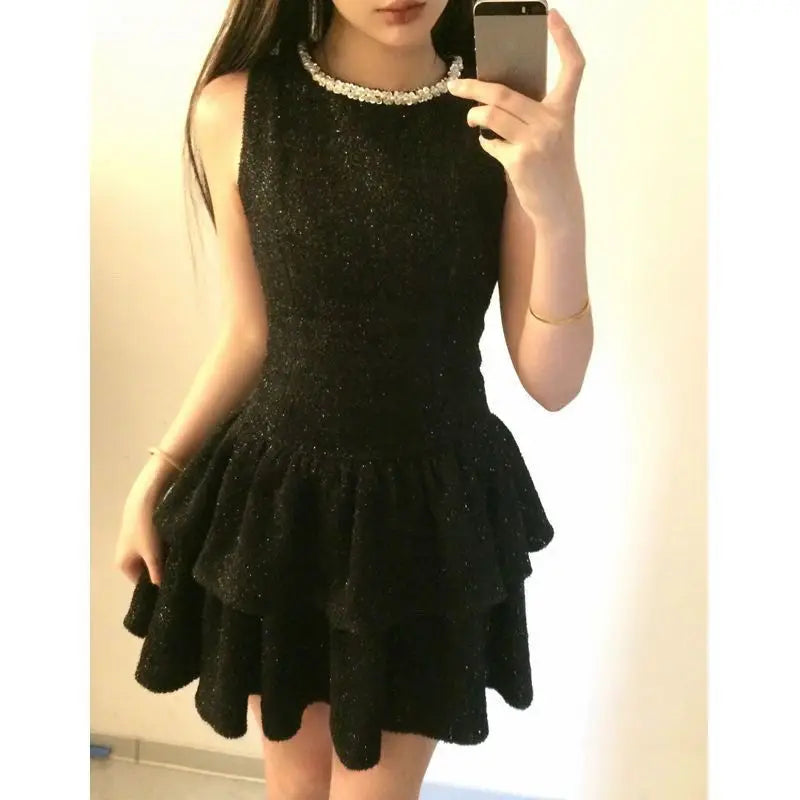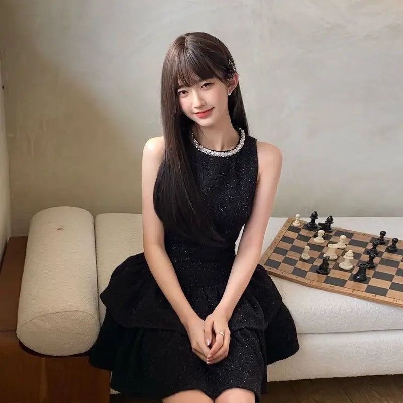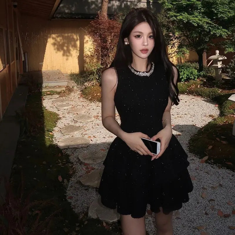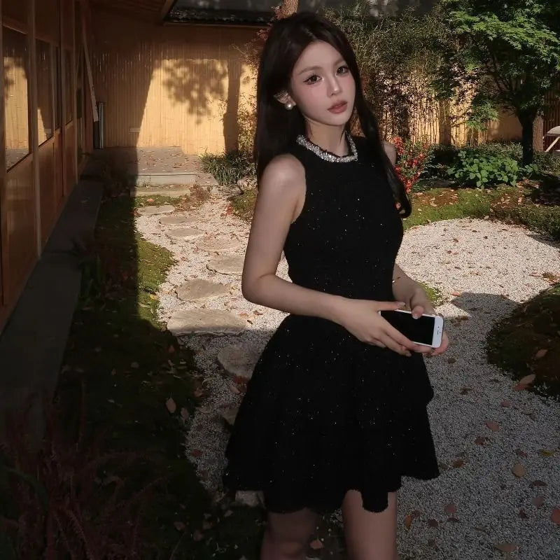 High End Temperament Diamond O Neck Sleeveless Korean Luxury Shinny Dress Y2k Aesthetic Harajuku Girl Clothes Korean Punk Dress