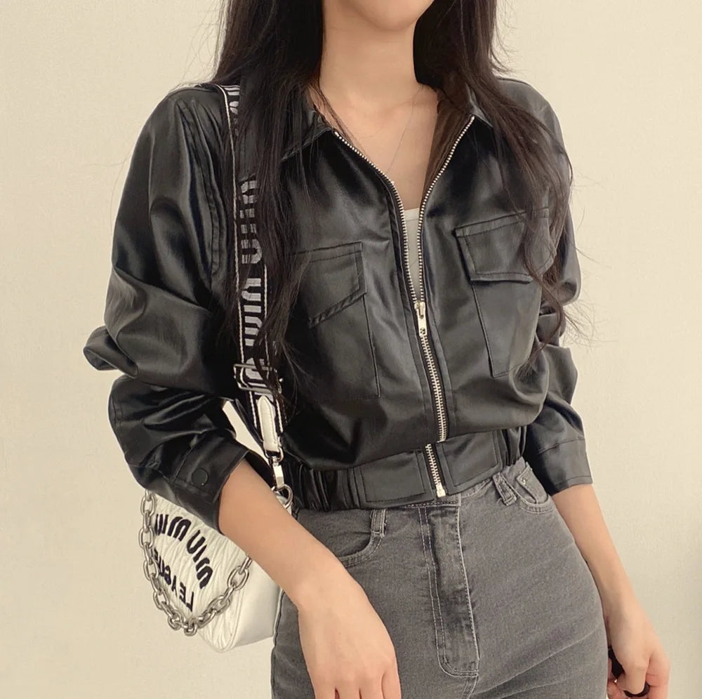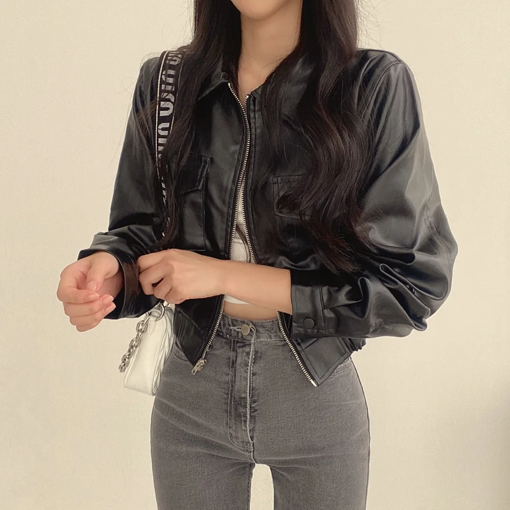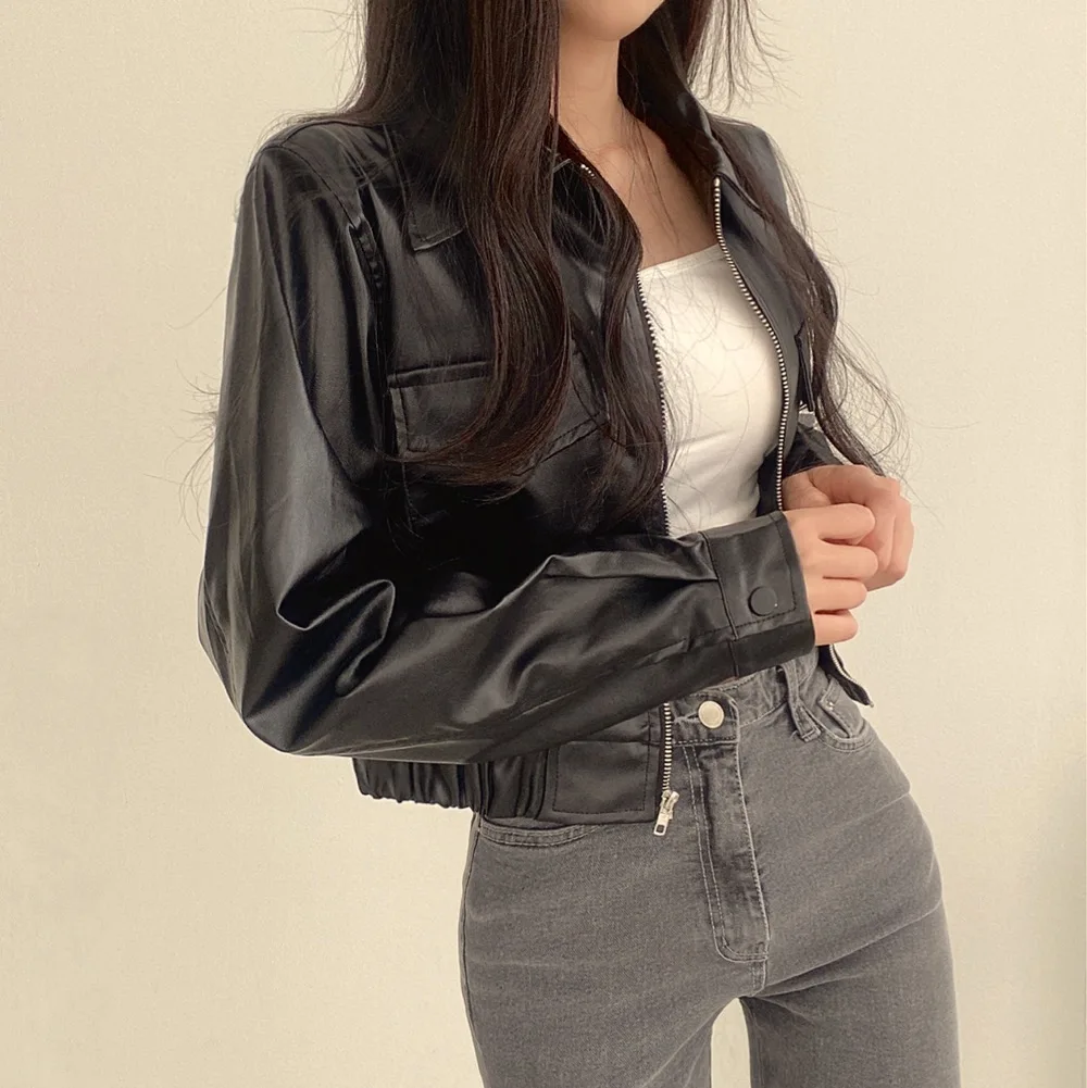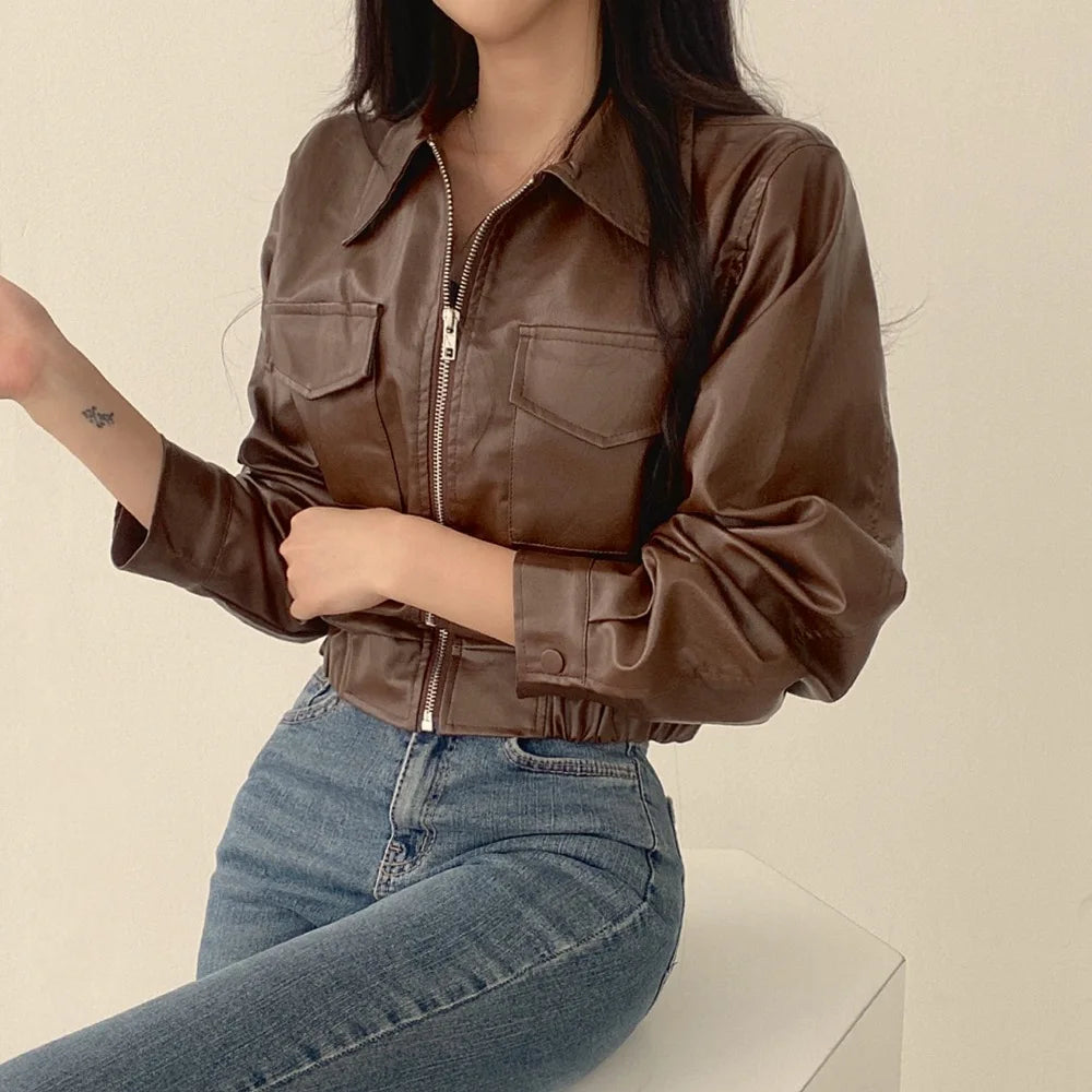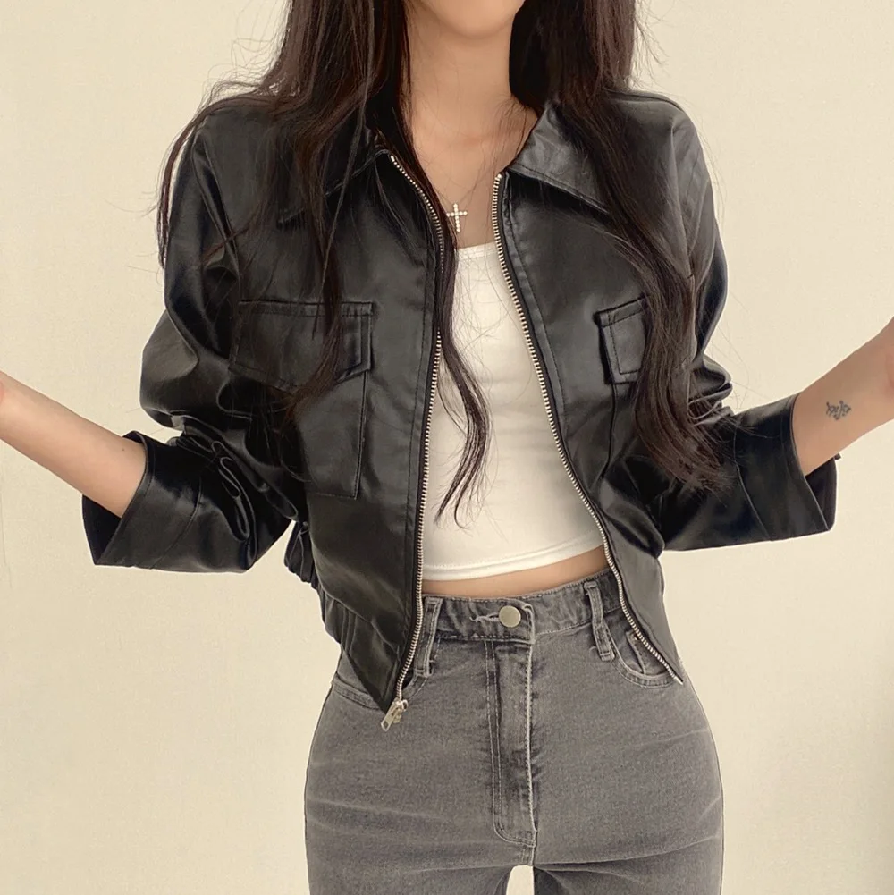 Loose Casual PU Leather Windbreaker Turn-Down Collar Long Sleeves Zipper Chic Moto Biker Coat 2025 Trendy Streetwear Jackets