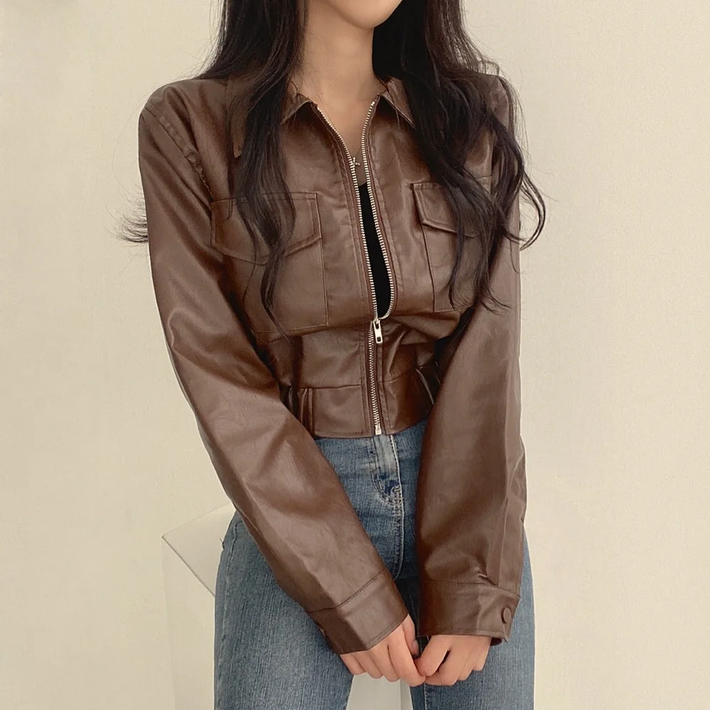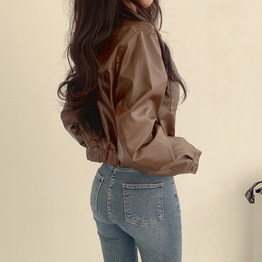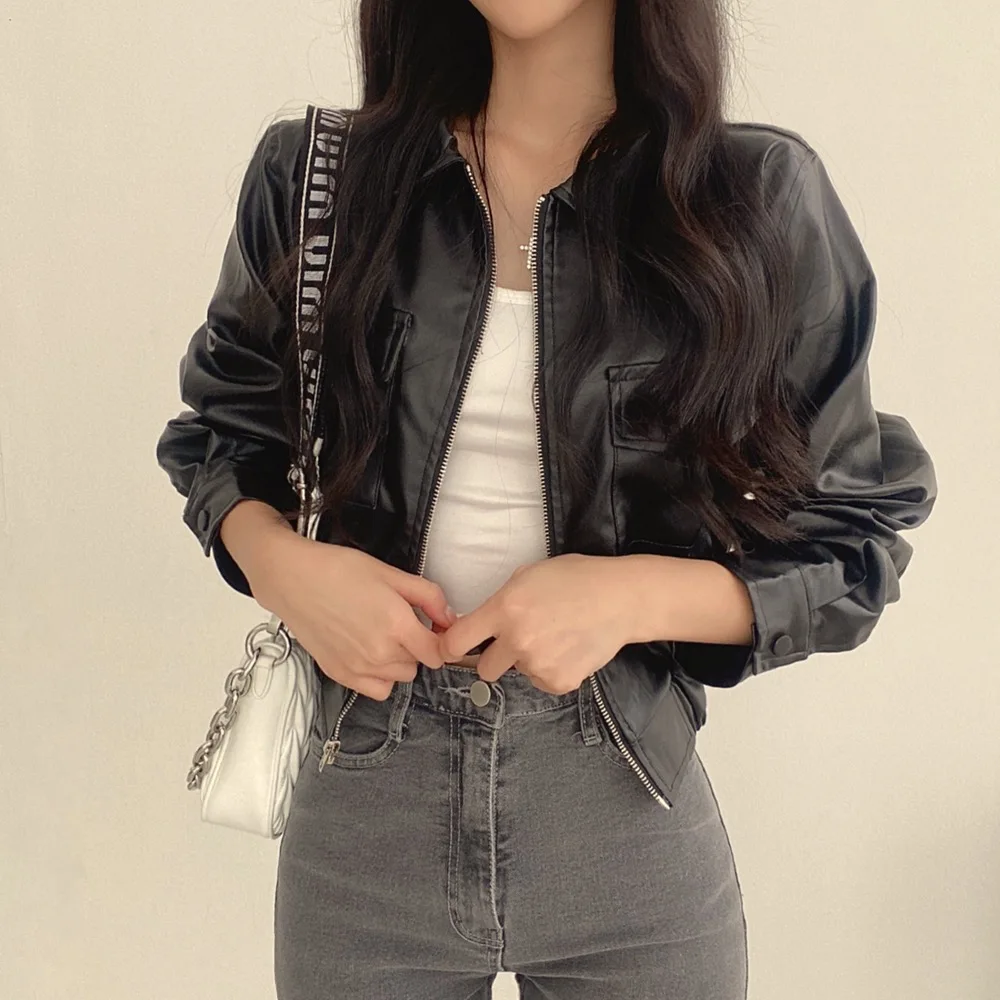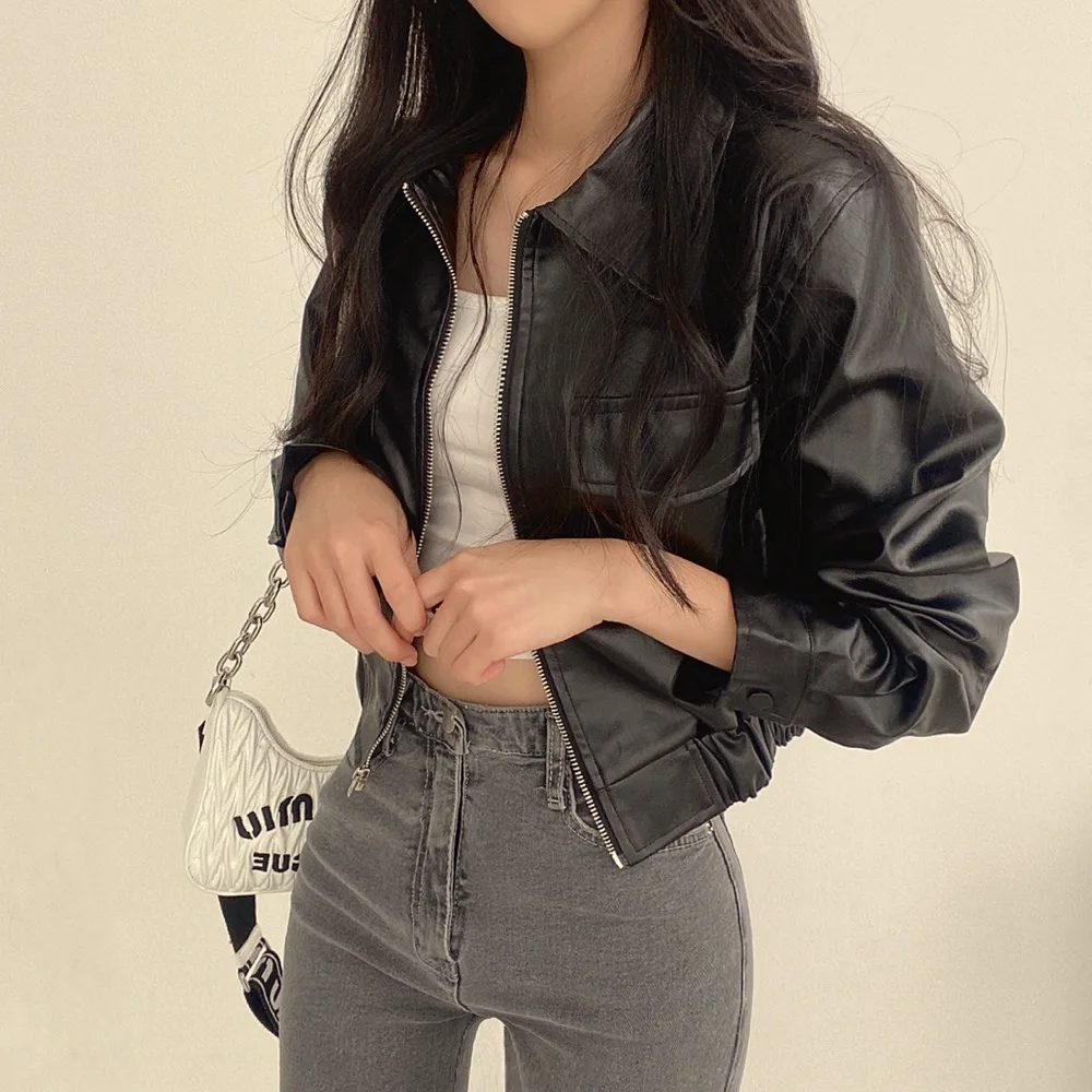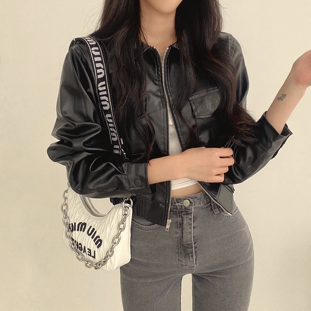 Loose Casual PU Leather Windbreaker Turn-Down Collar Long Sleeves Zipper Chic Moto Biker Coat 2025 Trendy Streetwear Jackets