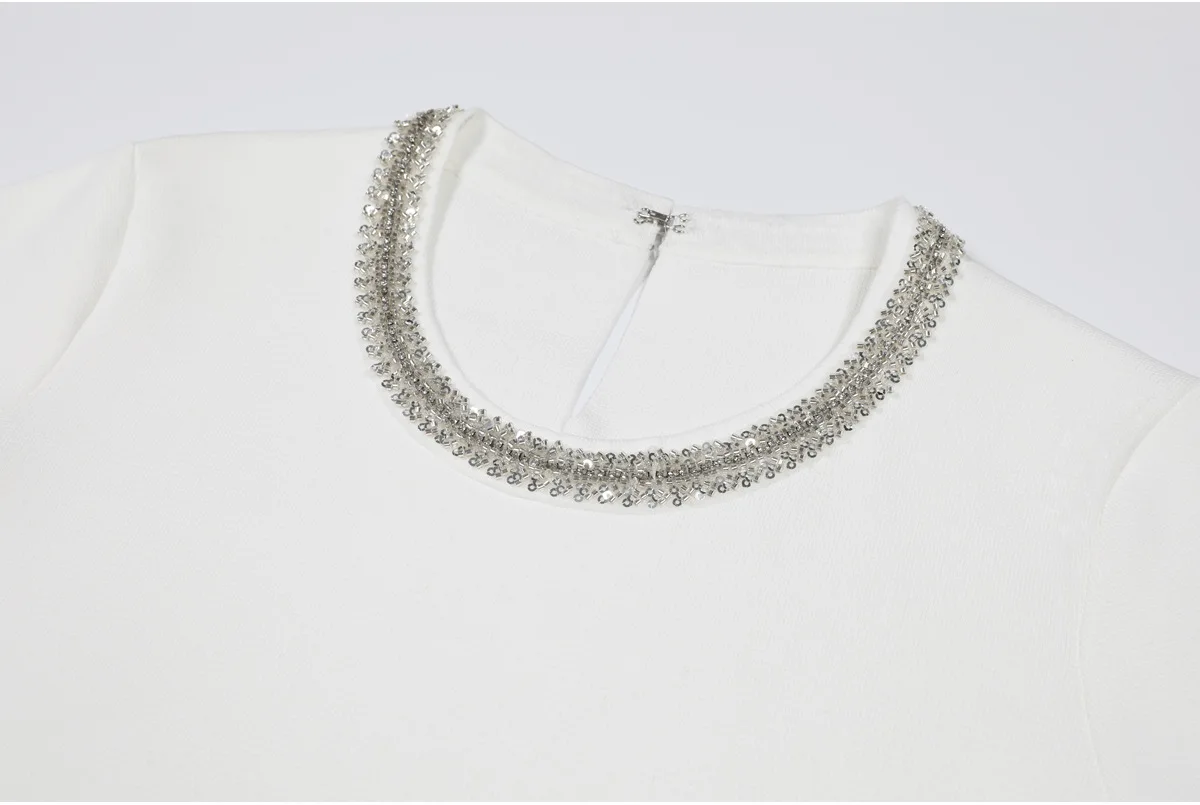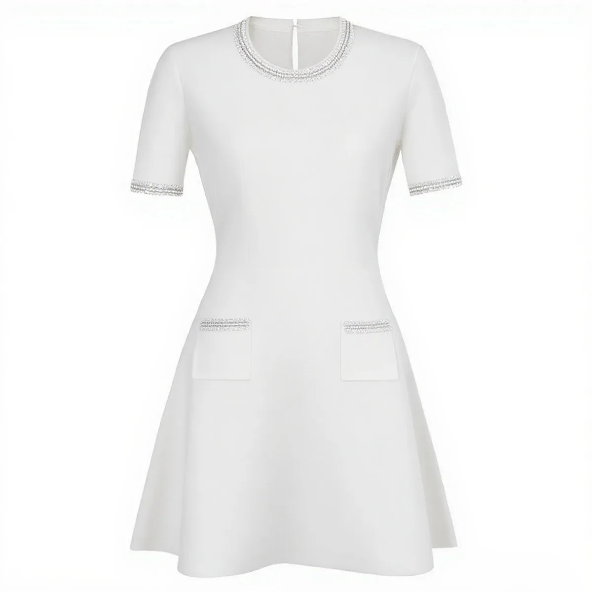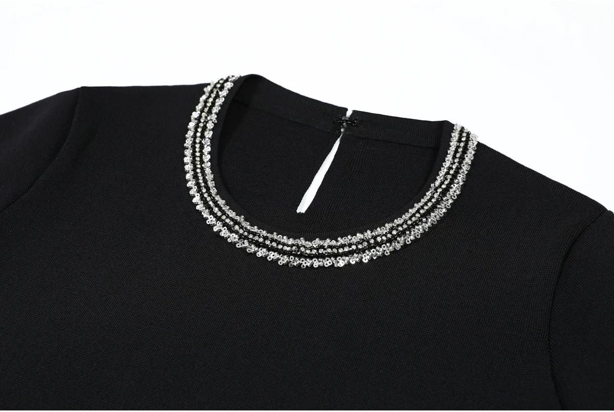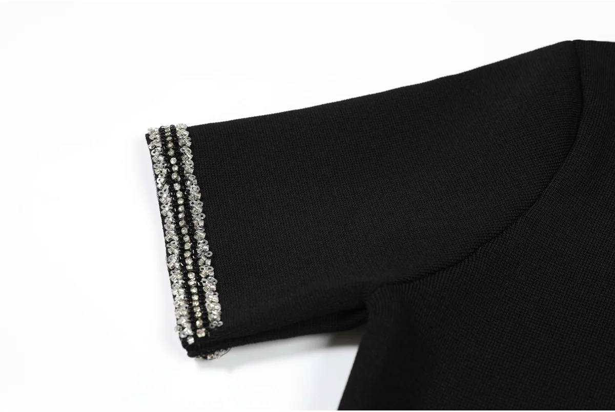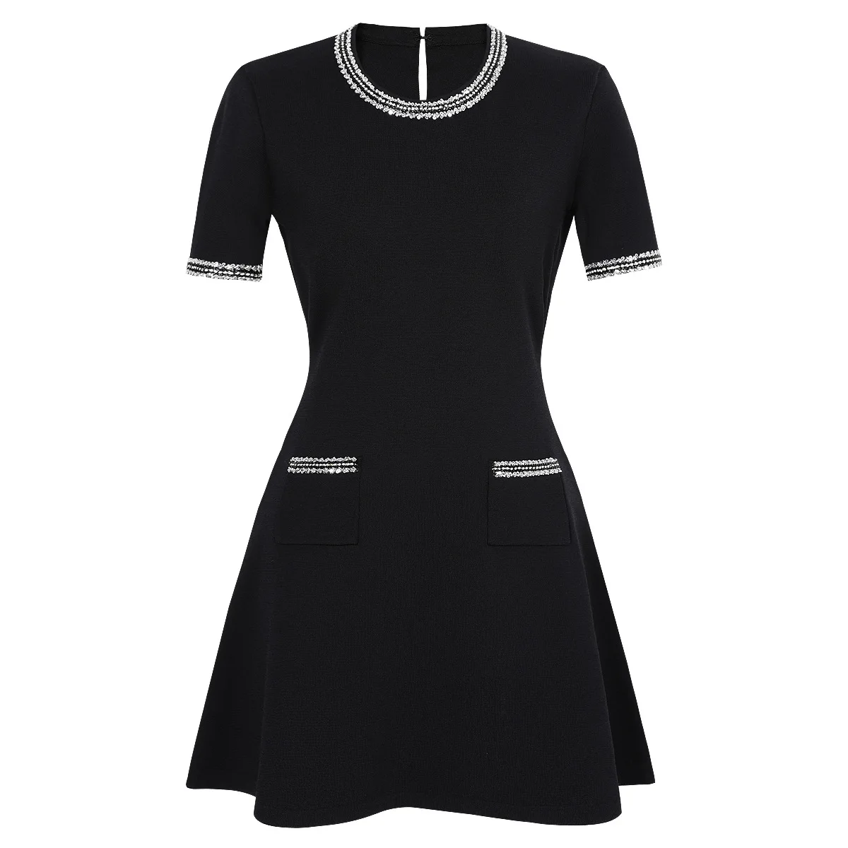 Luxury Diamond Beading Prom Dress For Women Summer New Office Lady Round Neck Short-Sleeve Slim A-Line Party Knit Dresses
