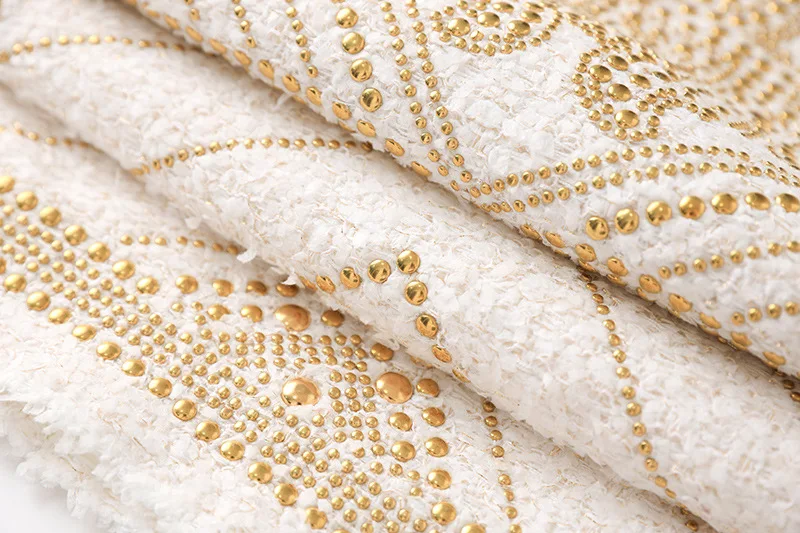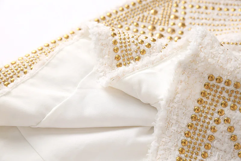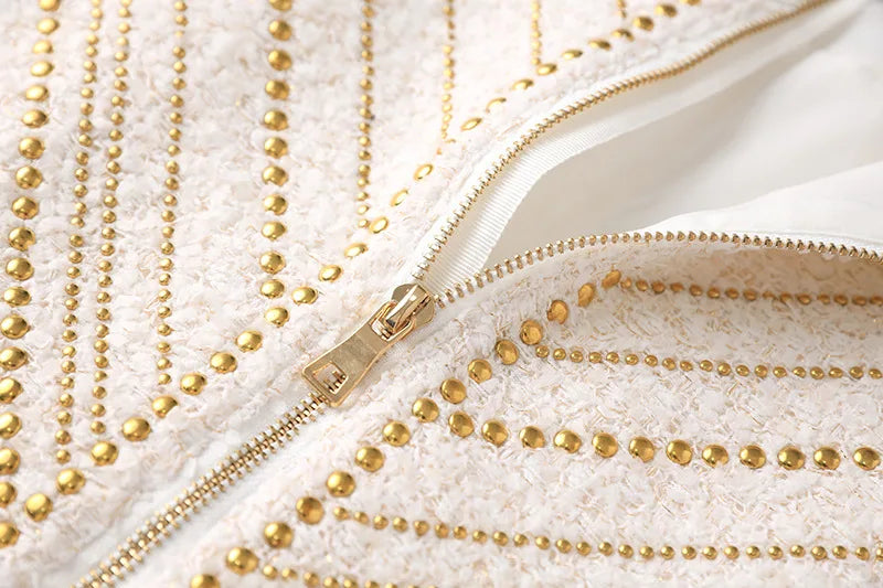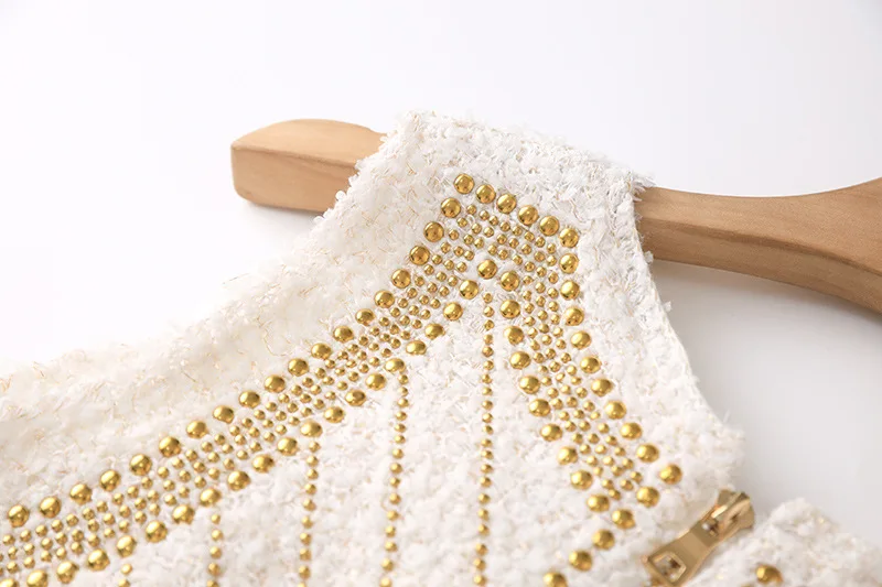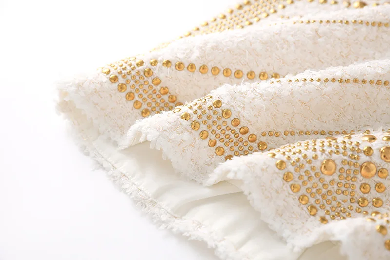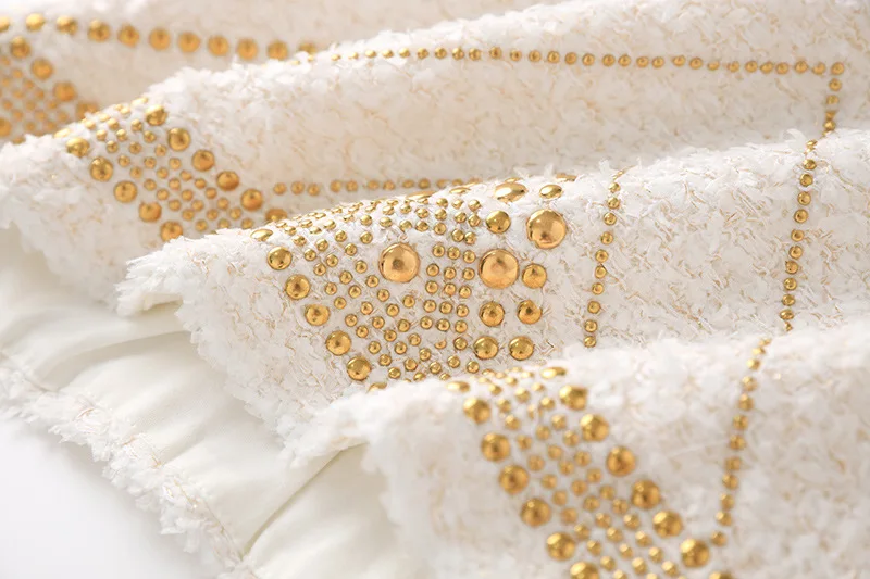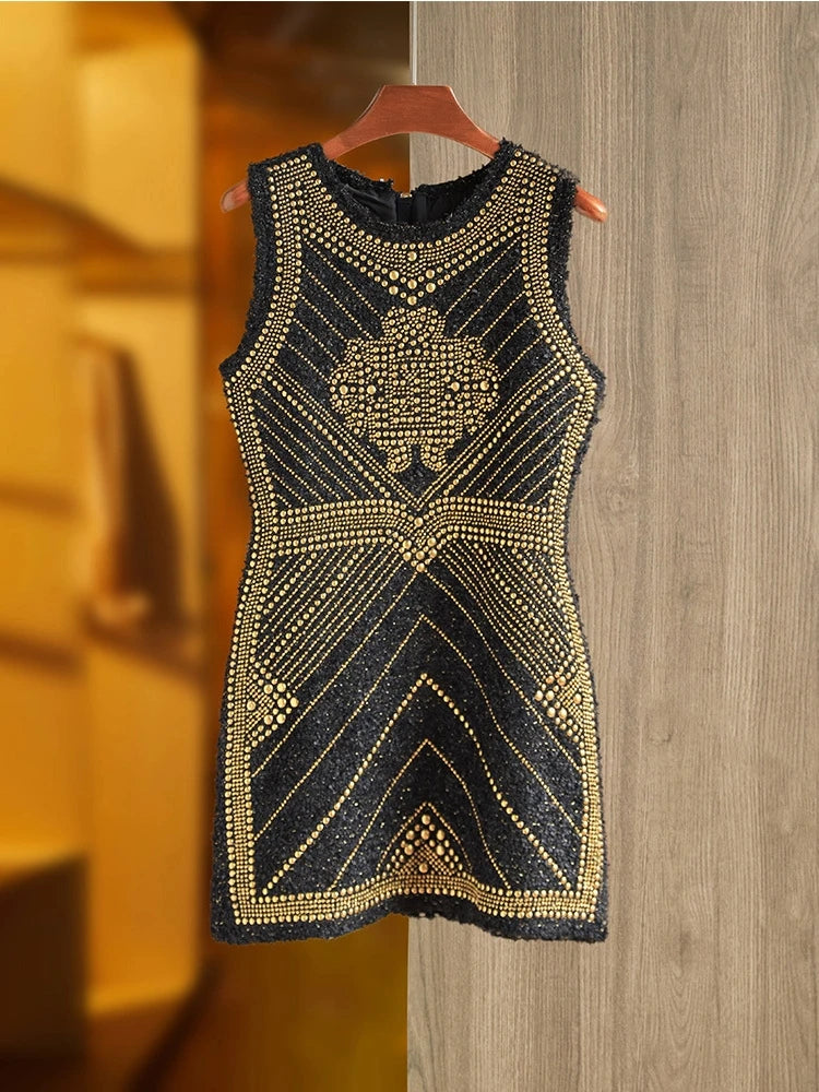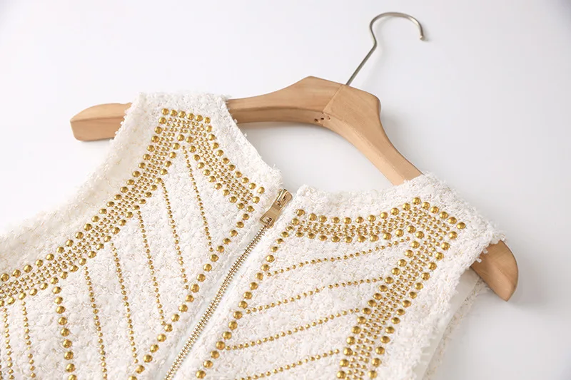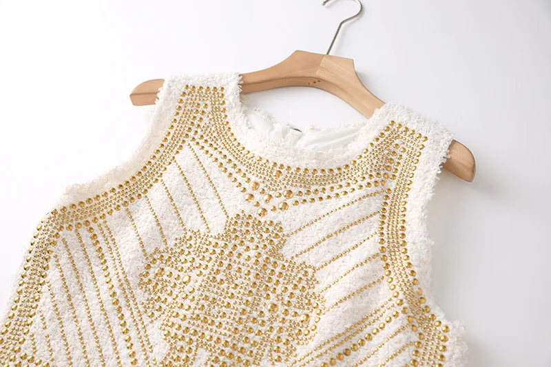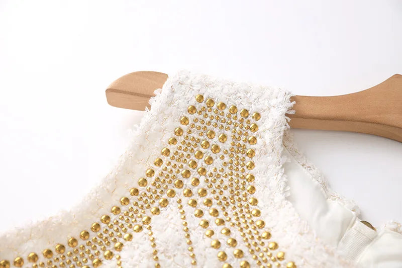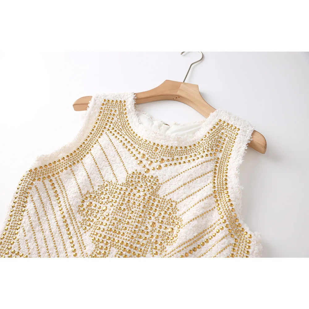 Retro Luxury Tweed Golden Rivets Sleevless O-Neck Dresses Women Shiny Silk Metal Rivets Pattern Dress Slim Mini Dress Female
