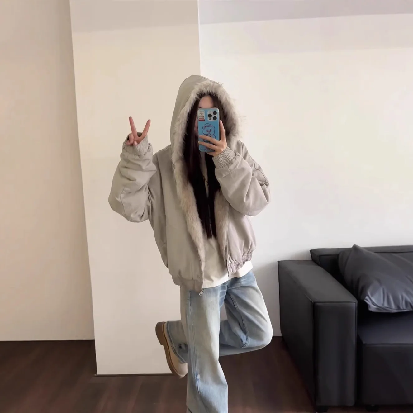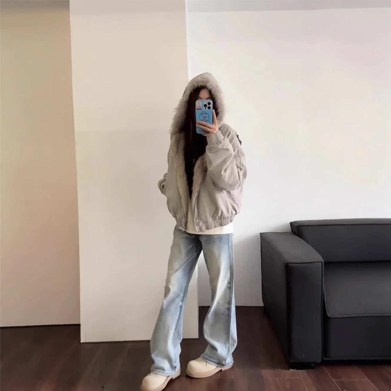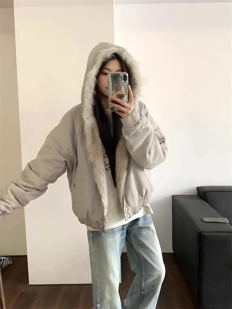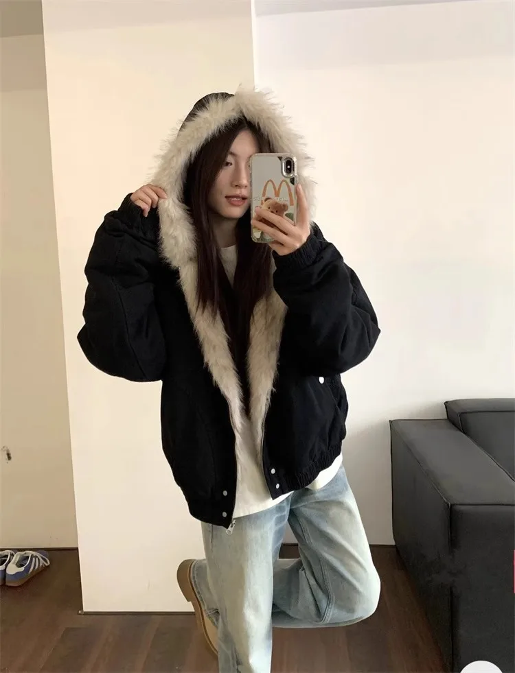 Thickened Faux Fur Collar Down Jacket Women Winter Workwear Couple's Outerwear American Style New Autumn Winter Cotton Coat