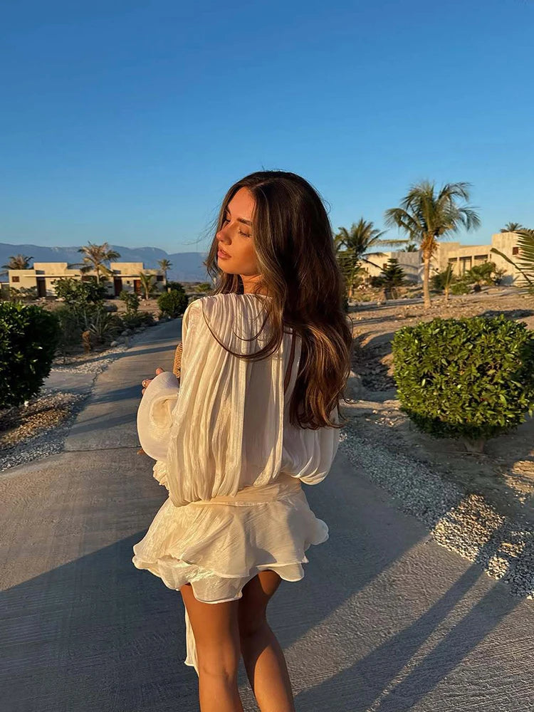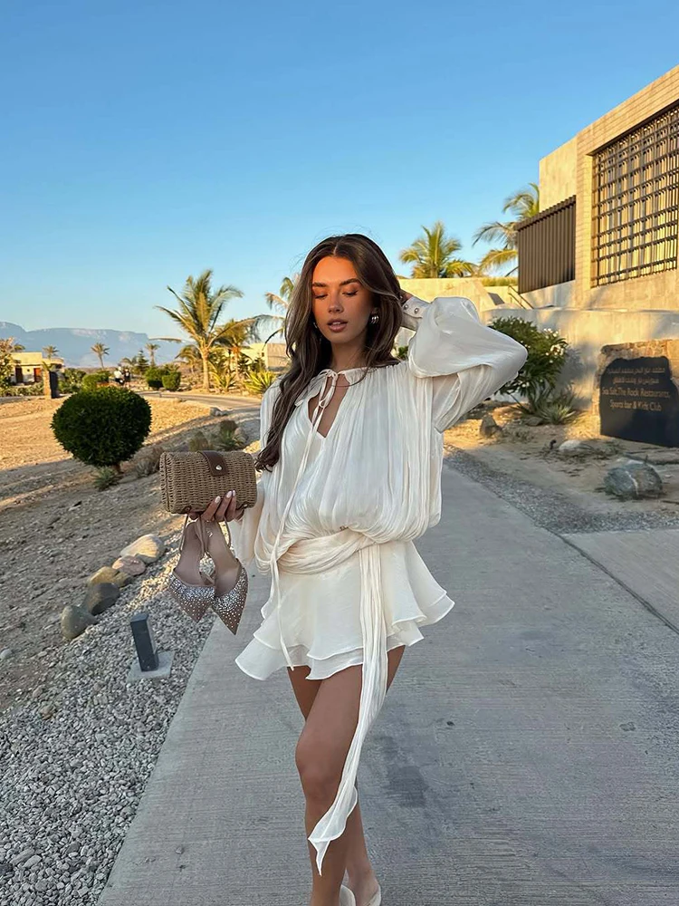 Vintage Puff Sleeve Ruffles Mini Dress Women Elegant Chic Lace Up O Neck High Waist Party Dresses 2025 Female Clothes Fashion