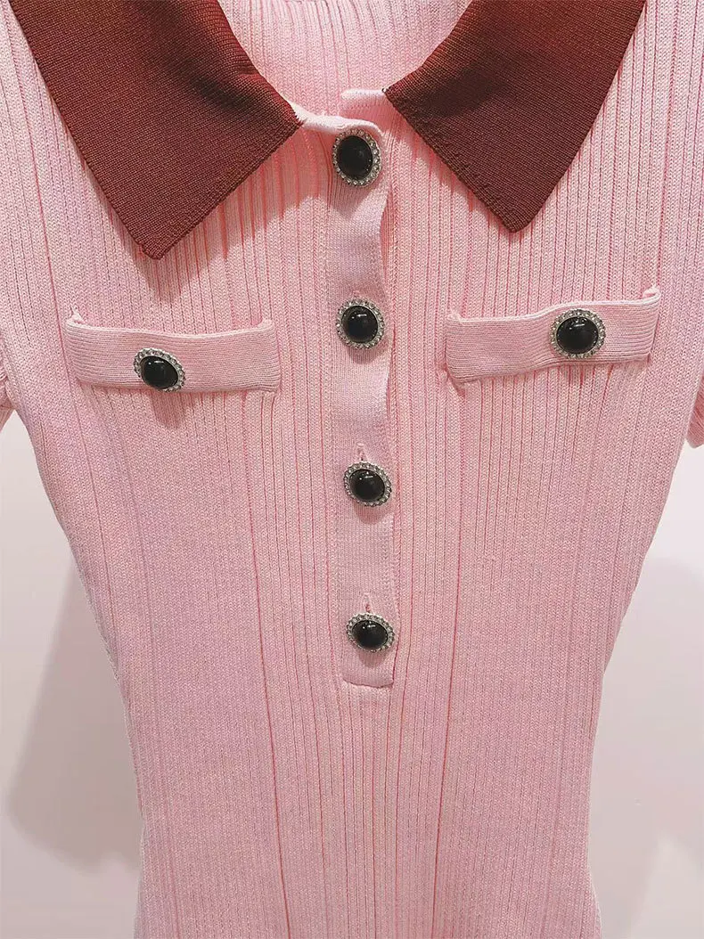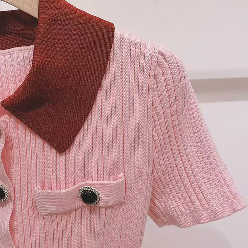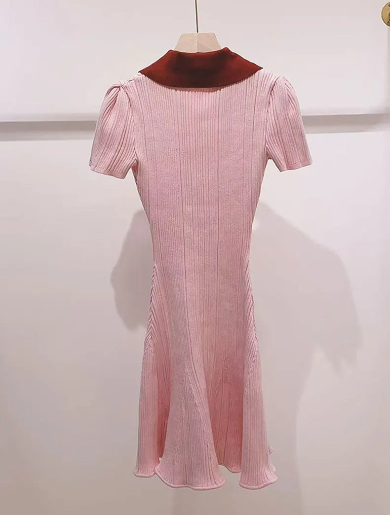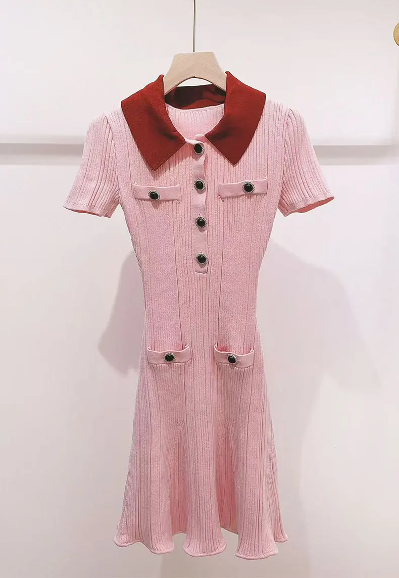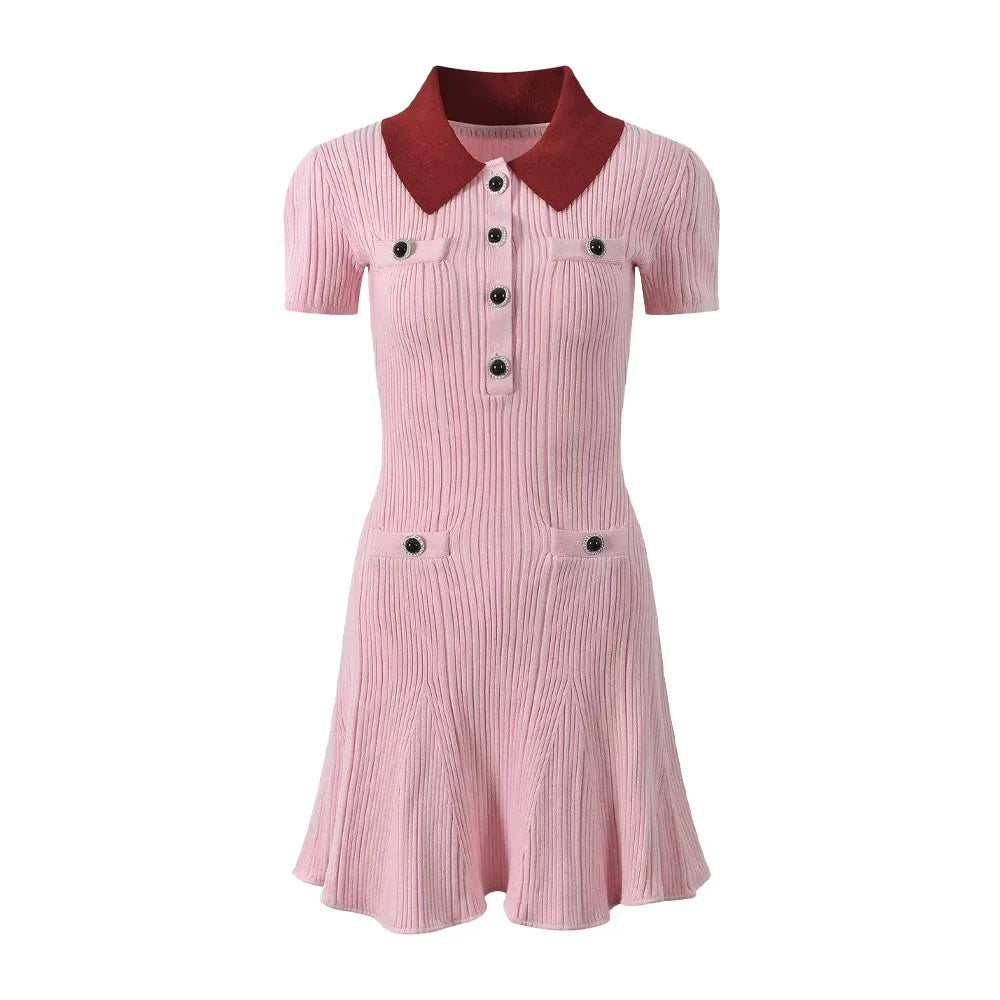Woman 2025 Summer New Fashionable Casual Solid Color Commuter Button Collar Short Sleeve Knitted Short A-Line Dress Female
