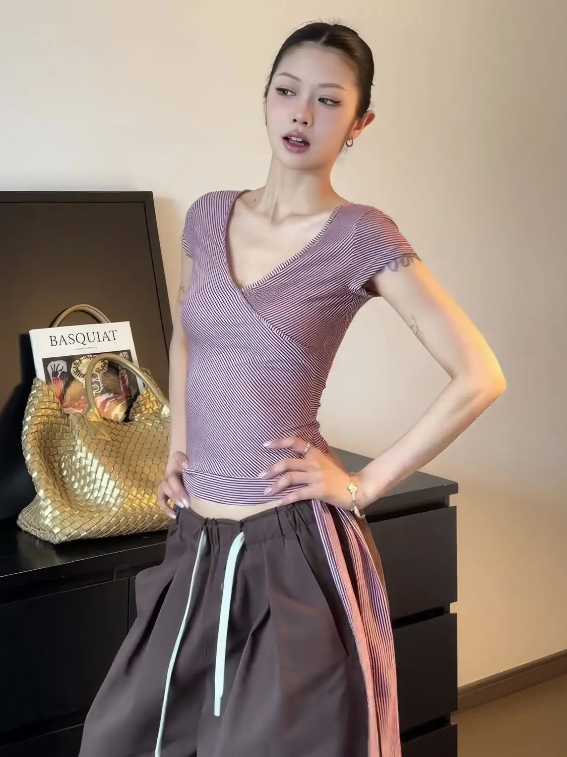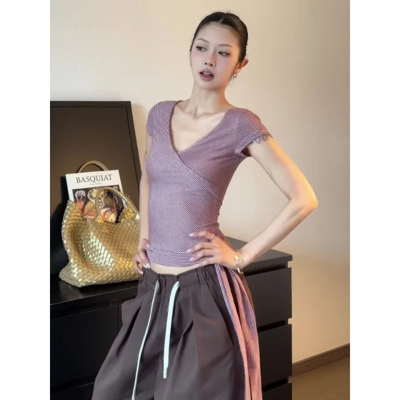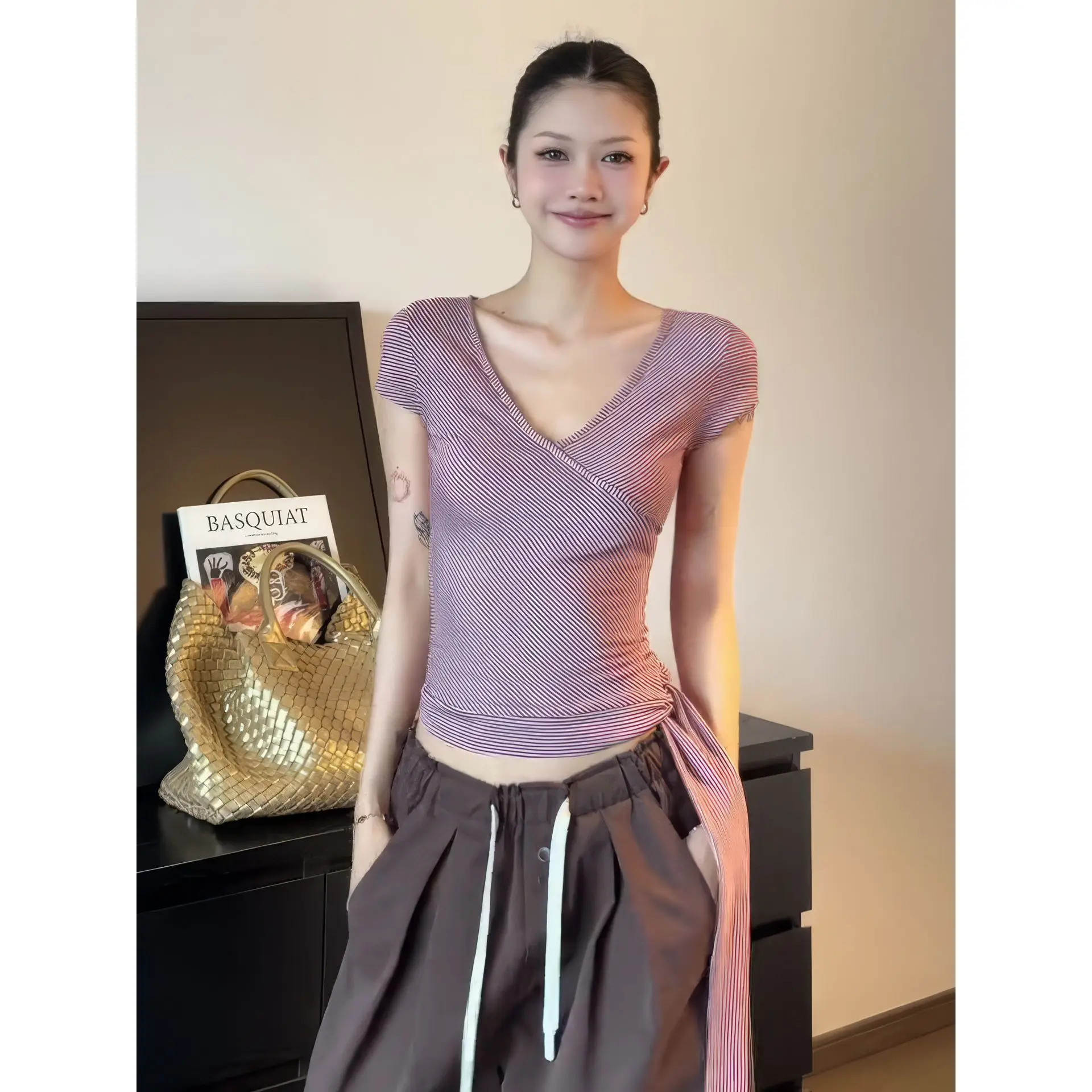 Women Clothes Summer Fashion Korean Simplicity Striped Solid Color V-neck Female All-match Appear Thin Screw Thread Short Sleeve