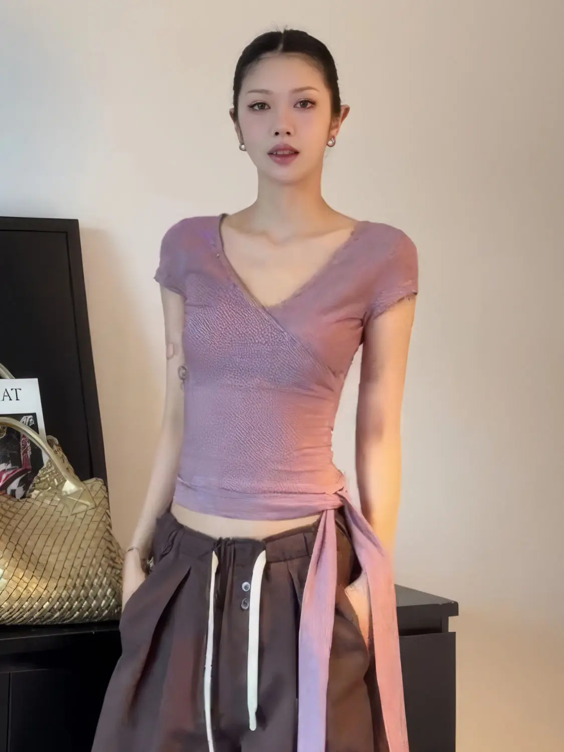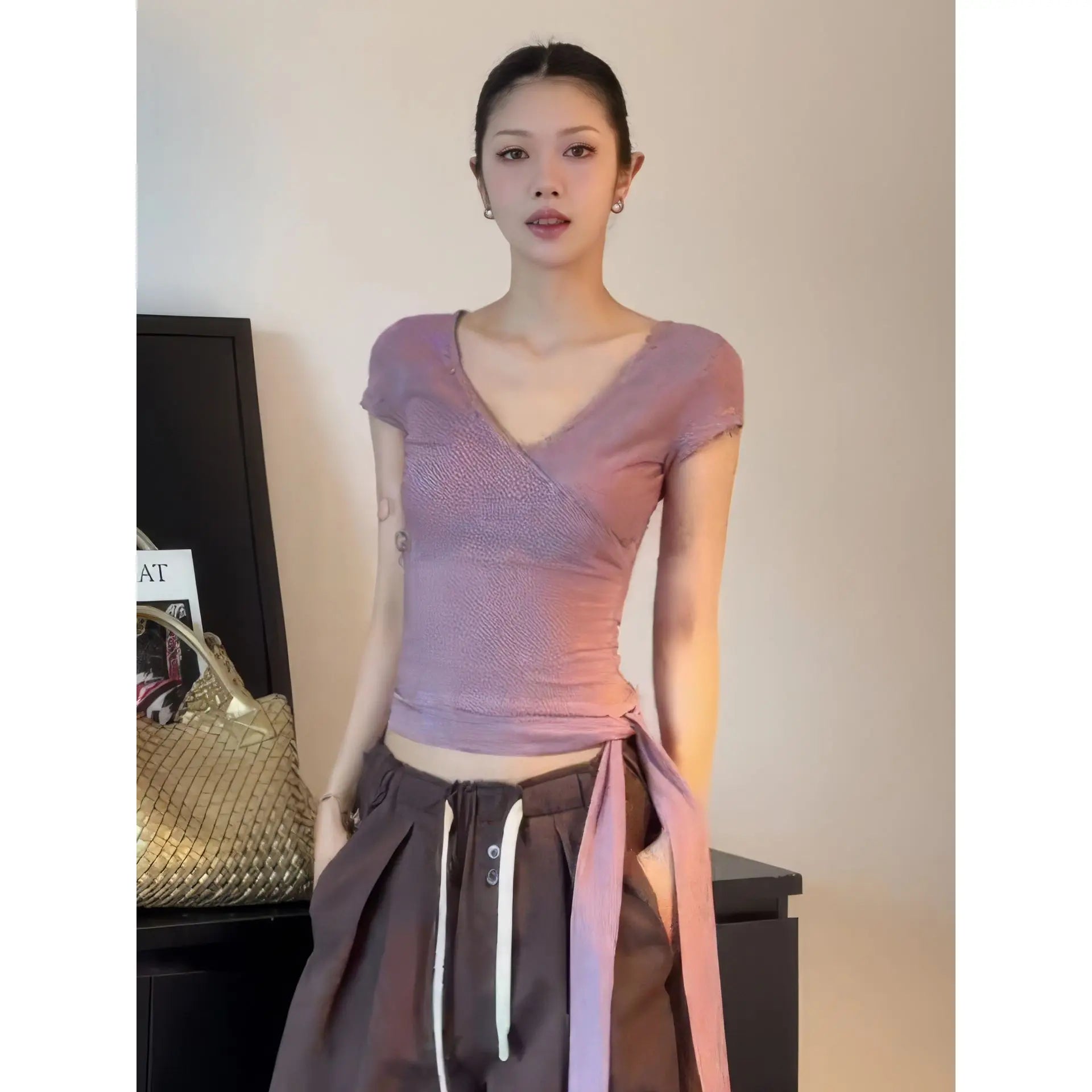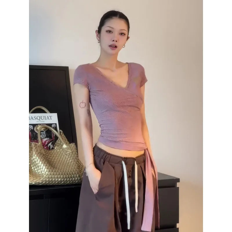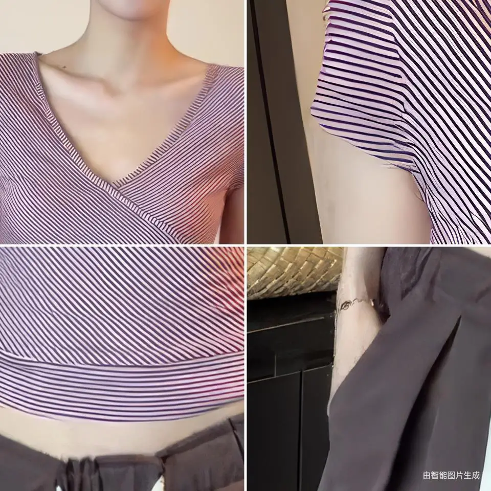 Women Clothes Summer Fashion Korean Simplicity Striped Solid Color V-neck Female All-match Appear Thin Screw Thread Short Sleeve