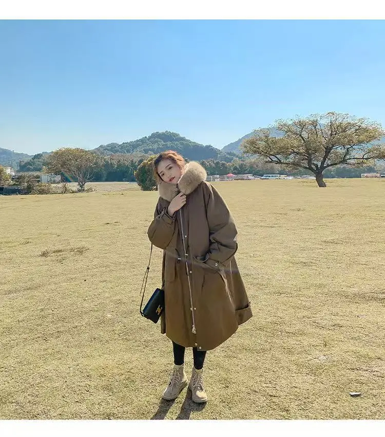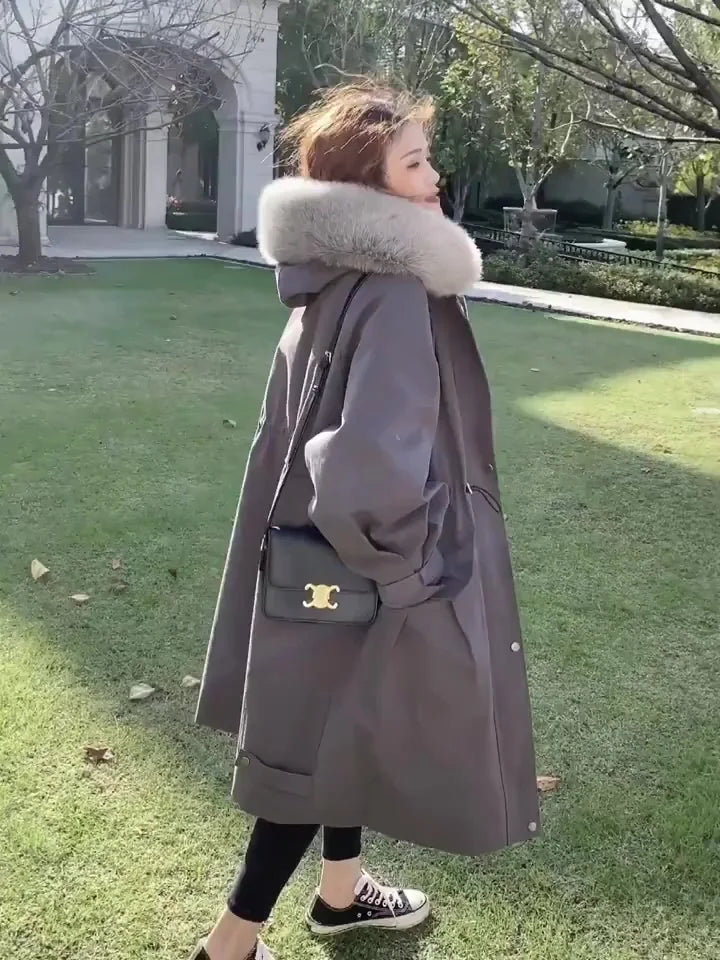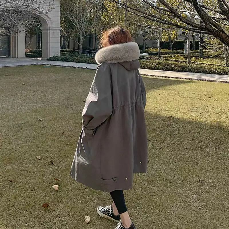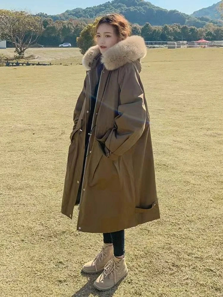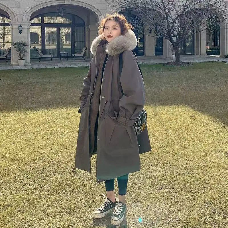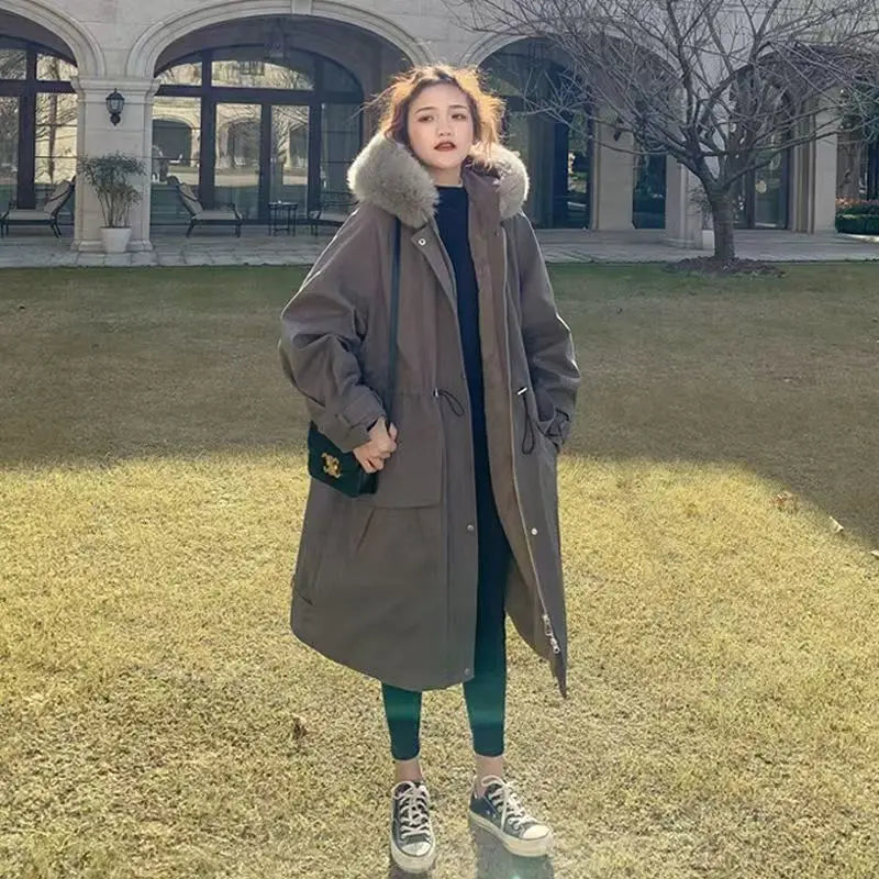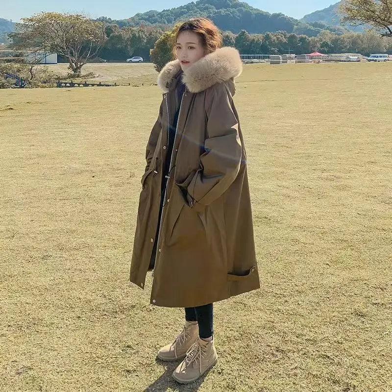 Women Winter 2025 New Cotton Padded Jacket Plush Thickened Padded Long Parka Vintage Korean Jacket Faux Fur Hooded Jackets